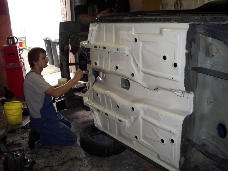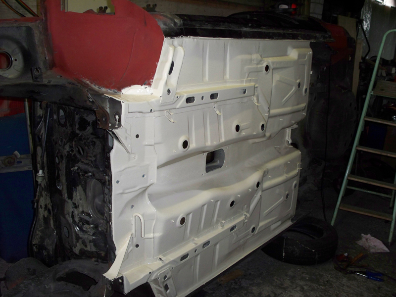 so gestern ging es weiter... haben den unterboden komplett sauber gemacht und ich hab die risse unter den sitzen ausgebohrt und neue bleche eingeschweißt. danach hab ich schonmal eine schicht des ersten wundermittels aufgetragen. ich finde das ergebnis kann sich sehen lassen