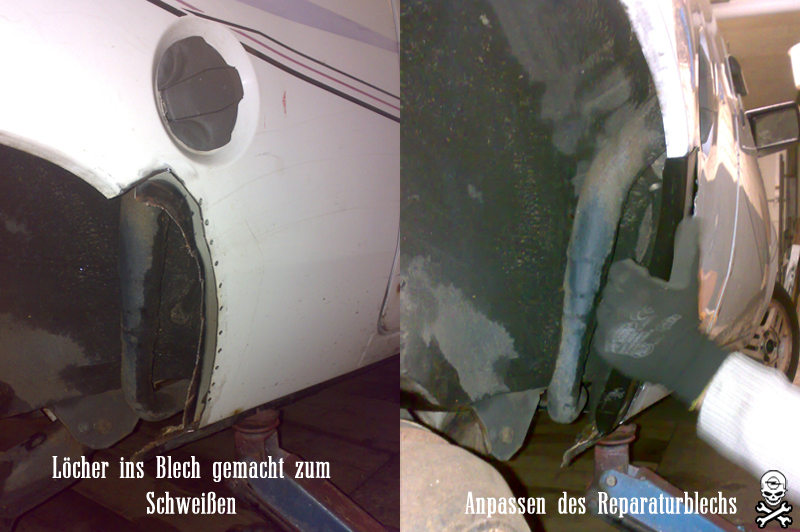 Als nächstes haben wir dort mit der Lochzange ein paar löcher zum schweißen in die außenwand gemacht ;-) und das Raparaturblech angepasst ...