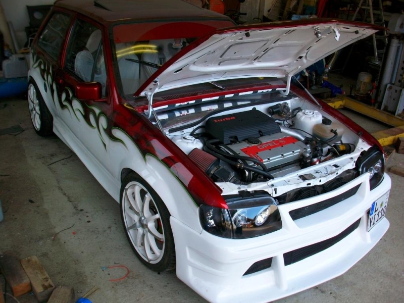 Corsa a mit 1,6 SEI ,Max geweiteter Kopf von Risse mit Polierten Auslass - öffnungen,Neue Ventilsitze,sowie Polierter Ansaugbrücke, 302° Nockenwelle, 45ér EinzeldrosseKlappen,4-1 Fächerkrümmer,einstellbares Nockenwellenrad, DZ1 EXKLUSIVE 7,5J x 16 195/45 und 9J x16 225/40