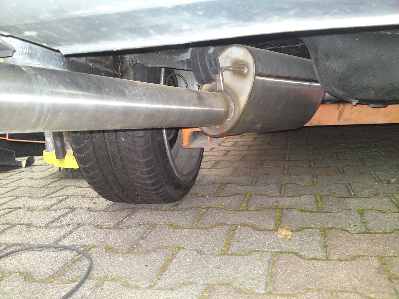 Auspuffanlage besteht nun aus dem originalen Fächerkrümmer über ein Flexrohr verbunden mit einem Euro 2 Kat(HJS) zu Mittel-und Endschalldämpfer von JettexFortex(Gruppe A) mit verlängertem Endrohr 70mm