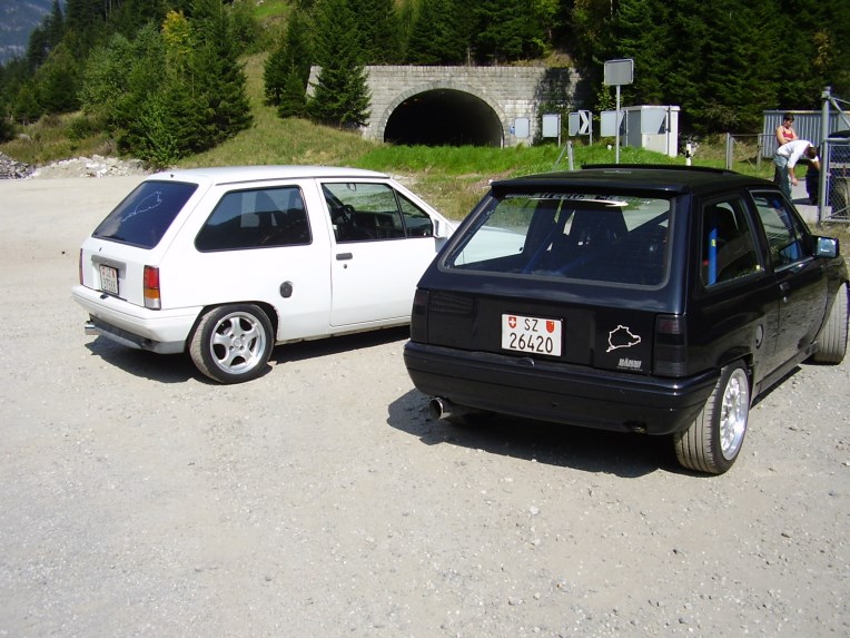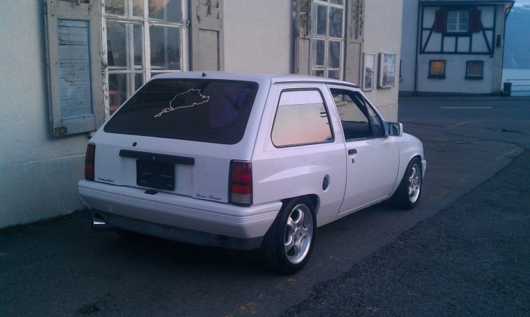 @ZebRockSki ja wo soll ich den anfangen? :P also der weisse 1.6l hat einen sehr grossen presönlichen wert.der Corsa gehörte mal meinem ehemaligem Vorarbeiter,der hatte die ersten umbauten gemacht.als er mich in der Ausbildung mal über einen Pass mitnahm war ich hell begeistert vom Corsa.naja viele jahre später konnte ich ihn dann abkaufen und ich hielt den Corsa immer bei laune,kannst mal den Dani fragen,er hat mier kürzlich die Radläufe hi und vorne gemacht und er weiss wie viel spass das ding macht.ich fahre den corsa nur durch den Sommer,hege und pflege ihn.also mal ein paar technische Daten: gemachter C16SEI,KW Gewinde v2,komplett PU buchsen,Chassis verstärk, Wichers Überrollkäfig aus Stahl weiss pulferbeschichtet,Domstrebe,Stahlflegleitungen,Kadett GSI 16V bremsen vorne,innen ausgeräumt,2Sparco Vollschalensitze und ein altes Panasonic Radio für zwischen durch.Carossierie ohne schiebedach,ohne heckspoiler,Radläufe hinten frisch eingeschweisst durch Daniel :top: , hi + vo gezogen mit einer neulackierung im Original Casablanca weiss.Felgen 14Zoll mit Yokohama A539.