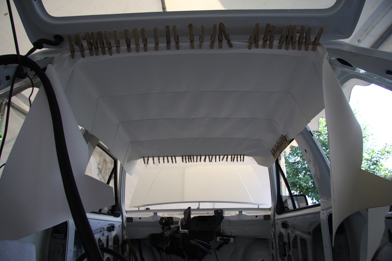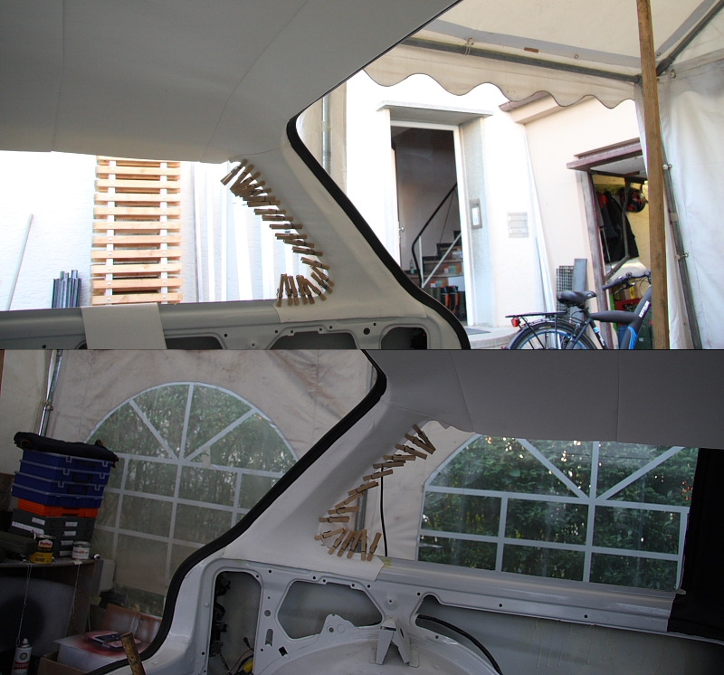 Wie dem auch sei, der neue Himmel ist ja jetzt da und wartet nur noch darauf eingebaut zu werden. Erstmal hängt er nur lose drin und mit den Wäscheklammern nur mal in Position gebracht um zu schauen ob auch alles passt. Naja die C-Säulen-Stücke sehen momentan noch etwas kurz aus. Muss ich aber nochmal schuen, vielleicht lässt sich das noch etwas ziehen. An sonsten werden die auch durch was schwarzes ersetzt.