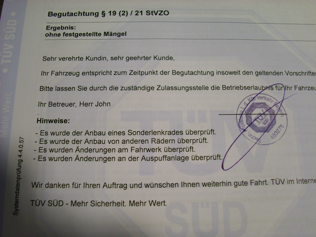 Werd demnächst mal beim TÜV vorbeifahren, mal mit dem Prüfer sprechen und Termin machen. HU und die ganzen Eintragungen.