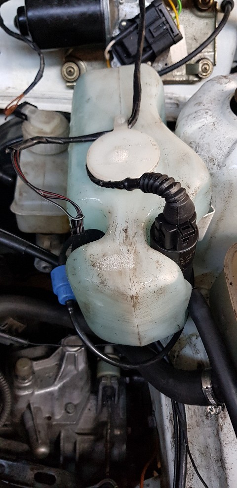Der Originalbehälter für das normale Scheibenwasser wurde bearbeitet, d.h. ein Loch wurde gebohrt an die Stelle, wo noch eine weitere Pumpe sitzen kann.