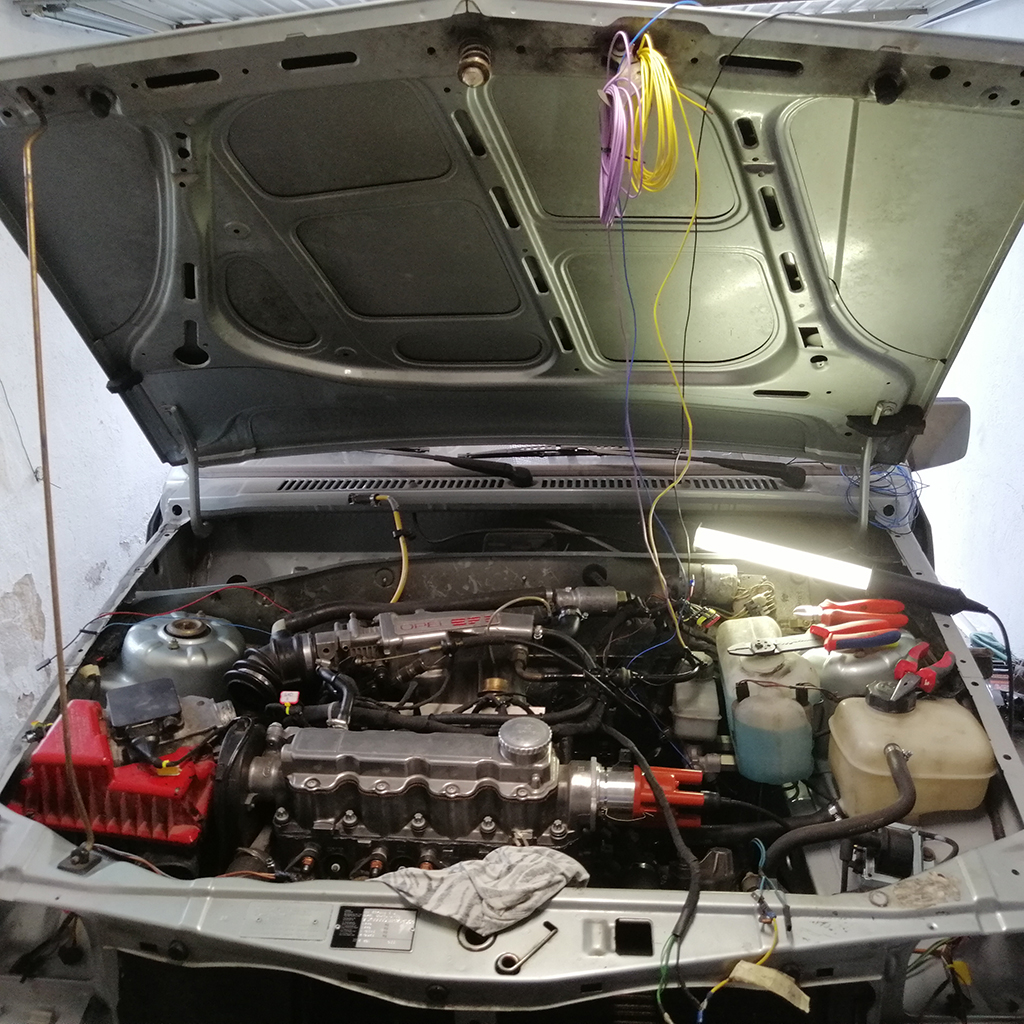 - Fahrzeug ist jetzt aufgebockt, damit ich überall drann komme.