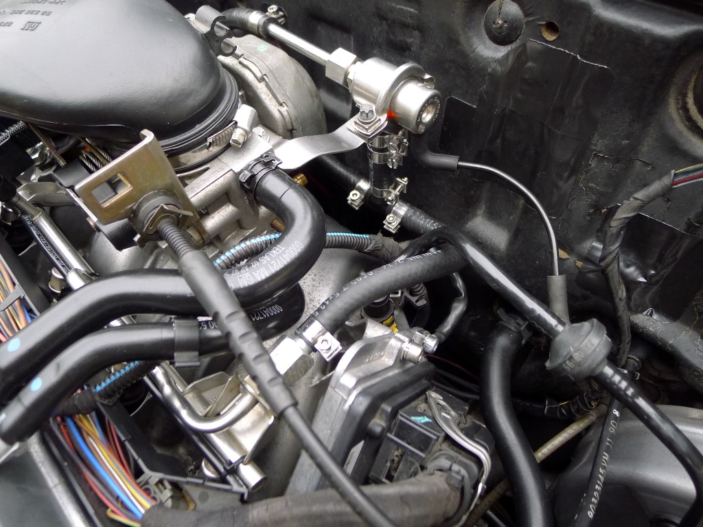 Ich suche mir also einen Platz im Motorraum, baue mir ein Halteblech, besorge ein 8-10-8 mm T-Stück und verschlauche alles. Zulauf, Rücklauf und Unterdruck. Praktischerweise war der Anschluss am BKV Rückschlagventil ohnehin frei. Den BKV Schlauch vom Vectra konnte man dank Heissluftföhn und etwas biegen übrigens auch übernehmen. Gaszug vom GSI passt 1:1.