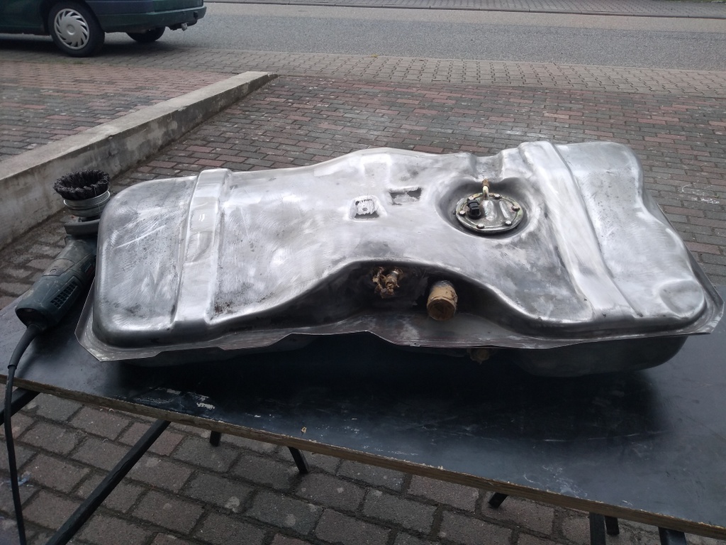 Tank mit Topfbürste gestreichelt und mit Fertan eingedieselt. Tag später mit Bedliner gelackt.