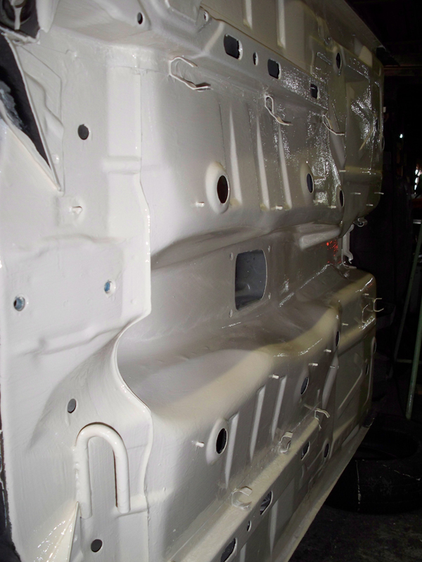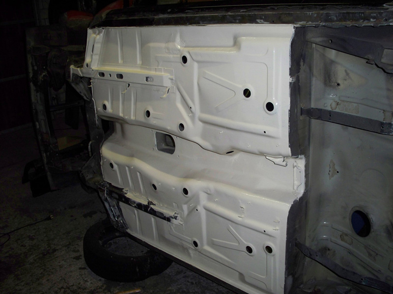 so gestern ging es weiter... haben den unterboden komplett sauber gemacht und ich hab die risse unter den sitzen ausgebohrt und neue bleche eingeschweißt. danach hab ich schonmal eine schicht des ersten wundermittels aufgetragen. ich finde das ergebnis kann sich sehen lassen