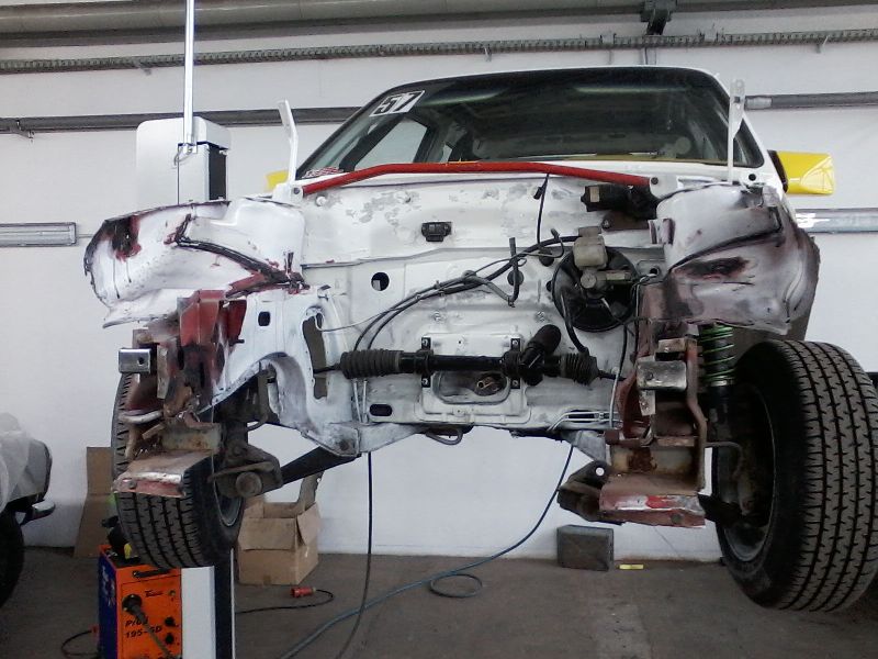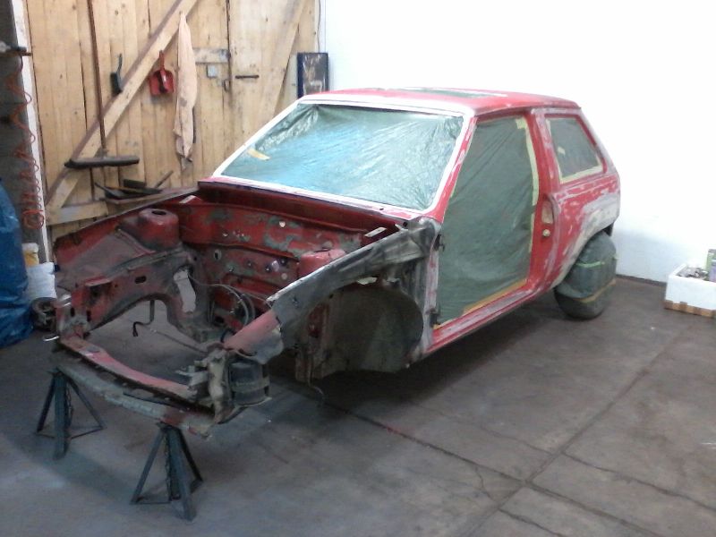 Dann gings seit April vorigen Jahres nach und nach vorran mit den ganzen umbauten. Nach vielen Problemen und dem letzten schweißen der neuen Frontmaske ..,.... ... und dem nochmaligen Überarbeiten des Lackkleides ...... ... steht er nun mit eingebautem Motor noch weit vom Ziel entfernt.