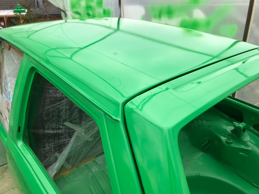 Nachdem alles fertig grundiert, gefüllert und geschliffen war, haben wir alle Teile nochmal ordentlich gereinigt und entfettet um dann endlich zu lackieren. Diesen Job hat mein Kumpel Nanoukh übernommen. (Danke für Deine Unterstützung!) Zuerst wurden die Anbauteile mit 2K Basislack in Reingrün lackiert. Anschließend die Karosserie. Das Ergebnis war für eine Garagenlackierung sehr gut geworden. Als nächstes kam noch eine Schicht Klarlack drüber. Das hat nicht so gut funktioniert, es gab ein paar Läufer und auch etwas Orangenhaut. Mit schleifen und polieren konnte man aber noch einiges wieder rausholen. Ich war begeistert wie schön sauber und gleichmäßig jetzt alles aussah. Ich konnte es nun nicht mehr abwarten mit dem Zusammenbau anzufangen.