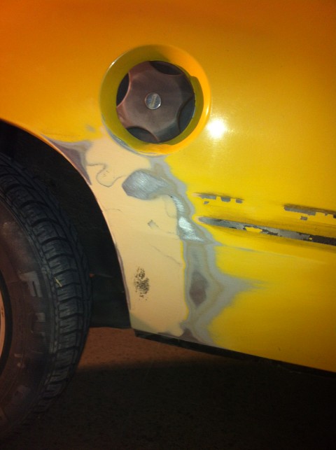 Der Linken Seitenwand ist zwar Gelb aber ich bin mit dem Ergebnis nicht zufrieden. Also muss es nochmal gemacht werden. Die Temperatur von der Dose und Raum + Auto waren leider zu niedrig, Lack hat eine Orangenhaut bekommen.