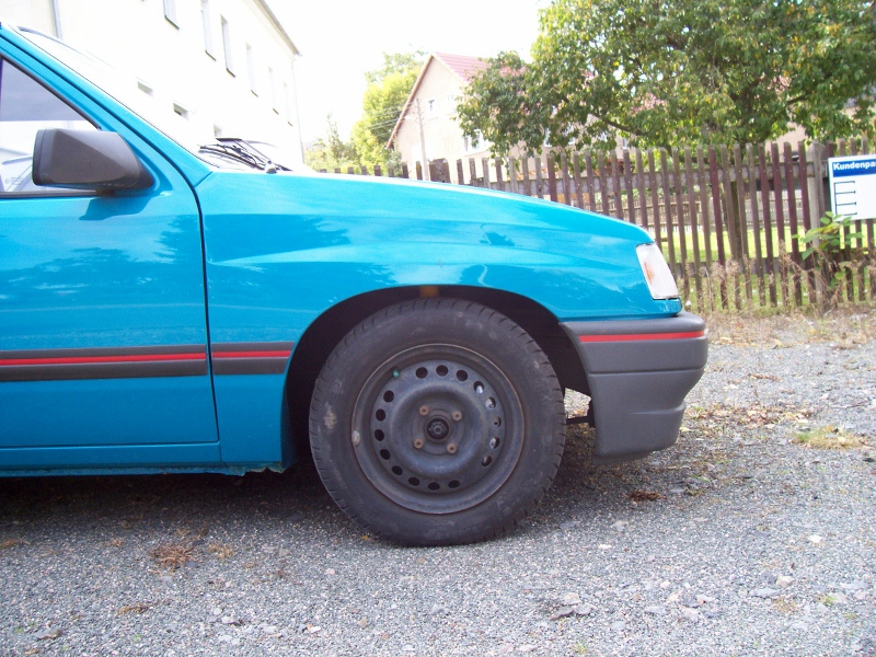 Gekauft hab ich den Wagen im Sommer 2012. Danach folgte ne Menge Arbeit. Vorn hatte er einen kleinen Auffahrunfall, also neuer Schlossträger, Haube und dann das übliche, Radläufe erneuern, Opelgold entfernen. Zum Schluss hab ich ihm noch eine Neulackierung spendiert, wieder im Originalfarbton, ein 60 / 40 Fahrwerk, neuen Unterbodenschutz. Eine Achsmanschette und Spurstange wollten noch gewechselt werden, frischer Unterbodenschutz und Hohlraumkonservierung. Für nächstes Jahr hab ich schon ein paar 15 Zoll Stahlfelgen parat, hab sogar die Auswahl. Einmal vom G Astra, eine ET 49 oder vom D Corsa mit einer ET 39. Die werden dann silbern lackiert um den originalen Look ein bißchen zu erhalten. Momentan überwintert er erstmal in einer trockenen Garage. So und nun Bilder!