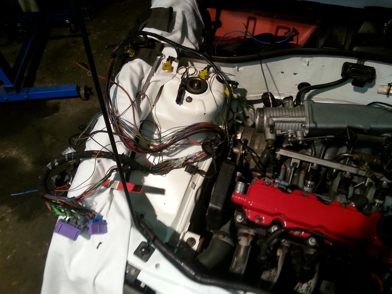 ein grossteil des kabelstrangs hing bisher in einer grossen schlaufe hinter der ansaugbrücke/über der lima. teilweise waren einige sachen auch noch fliegend verkabelt usw... funktionierte zwar alles (und um das zu überprüfen hab ichs auch erstmal n paar monate so gelassen) aber das geht besser. deshalb: kabelbaum raus, isolierung ab, tülle von der durchführung an der spritzwand versetzt und schonmal ein paar kabel die die saubere optik stören (zbsp oktanstecker) nach innen verlegt. da gehts dann demnächst weiter mit anpassungen. sieht sehr chaotisch aus. und um ehrlich zu sein bin ich mit kabeln immer noch nicht ganz so gut befreundet. mein hallenkollege dafür umso mehr. an dieser stelle mal einen riesen dank an ihn und seine schon mystische beziehung zur autoelektrik/elektronik. er ist zwar hier im forum nicht unterwegs, aber trotzdem