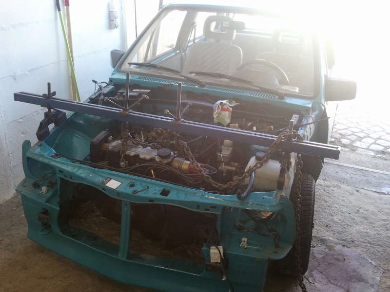 Vor allem haben wir mit einem original Wagenheber eines Corsa A, der eigentlich für einen Radwechsel gedacht ist, die Karosse mittels Brettern soweit angehoben das wir den Motor quasi rausziehen konnten...zum Glück ging das gut, das war ne ganz schön wackelige Angelegenheit!