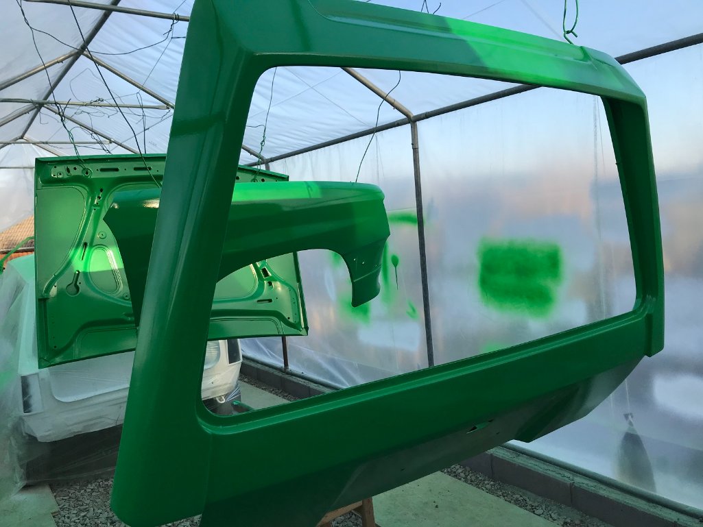 Nachdem alles fertig grundiert, gefüllert und geschliffen war, haben wir alle Teile nochmal ordentlich gereinigt und entfettet um dann endlich zu lackieren. Diesen Job hat mein Kumpel Nanoukh übernommen. (Danke für Deine Unterstützung!) Zuerst wurden die Anbauteile mit 2K Basislack in Reingrün lackiert. Anschließend die Karosserie. Das Ergebnis war für eine Garagenlackierung sehr gut geworden. Als nächstes kam noch eine Schicht Klarlack drüber. Das hat nicht so gut funktioniert, es gab ein paar Läufer und auch etwas Orangenhaut. Mit schleifen und polieren konnte man aber noch einiges wieder rausholen. Ich war begeistert wie schön sauber und gleichmäßig jetzt alles aussah. Ich konnte es nun nicht mehr abwarten mit dem Zusammenbau anzufangen.