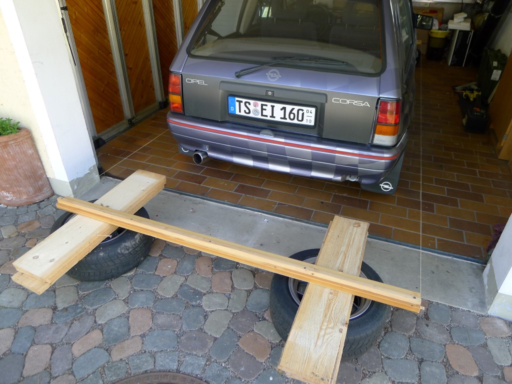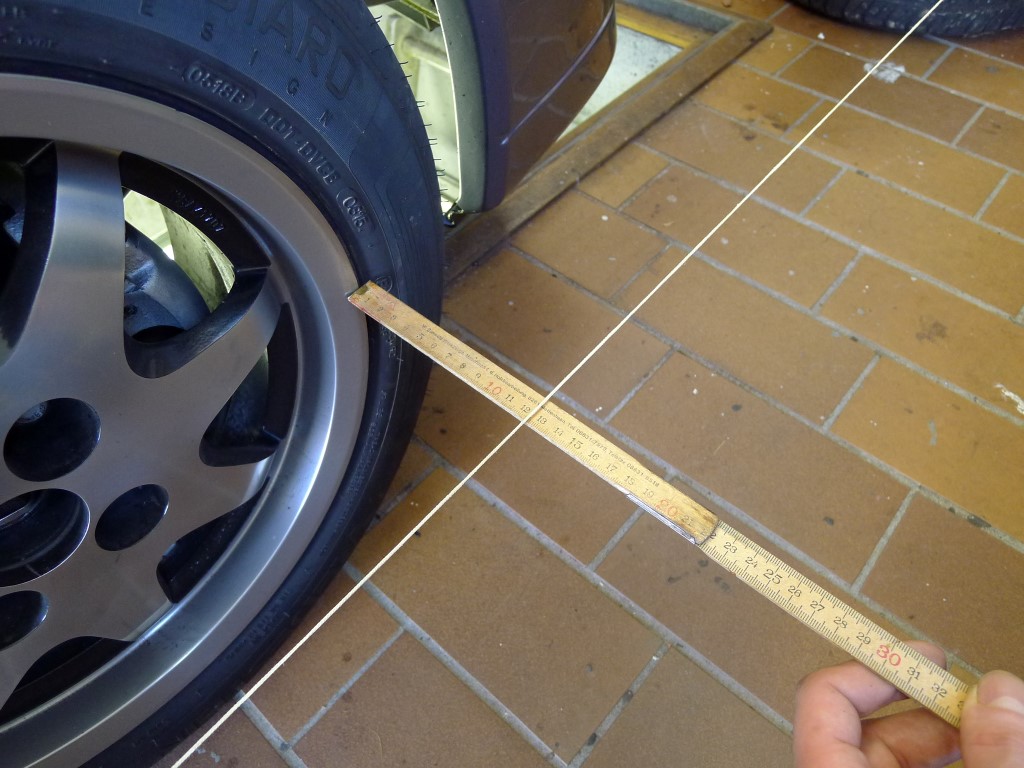 Man nehme 2 gleich lange Hölzer, spanne 2 Schnüre in der Höhe der Radmitte und richte das ganze exakt richtig zur Karosse aus. Lenkrad in Mittelstellung.