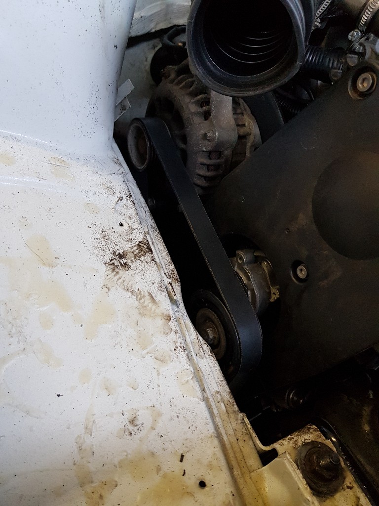 Dann habe ich noch den Riemen eingebaut. Der Vorhandene war zu kurz. Spannrolle entspannt und der Riemen läuft nun auch sauber über die neue Führungsrolle.
