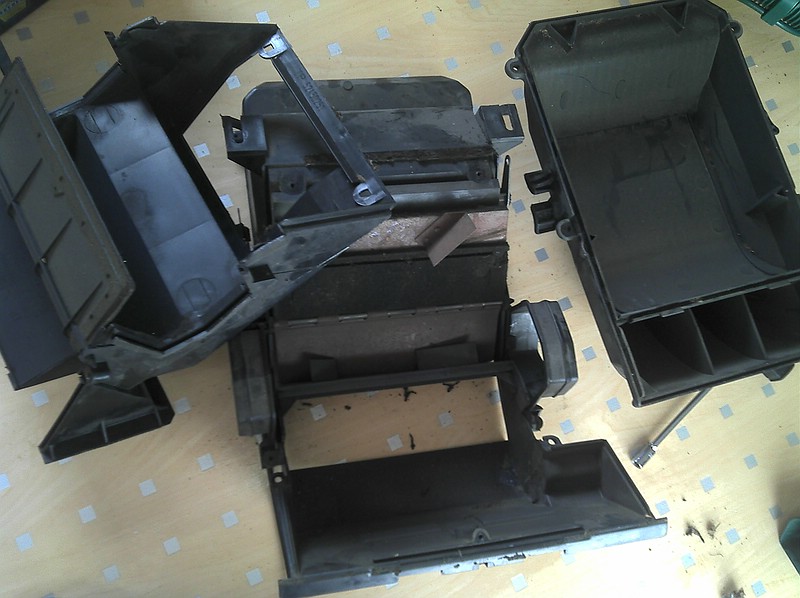 Den Lüftungskasten habe ich auch komplett zerlegt, gesäubert, was ich nur jedem empfehlen kann, man glaubt kaum, wodurch man sich seine "Frischluft" ins Auto holt. Dann habe ich ihn mit neuem Moosgummiband abgedichtet, den neuen Wärmetauscher reingebaut. Und so war auch der Fertig.