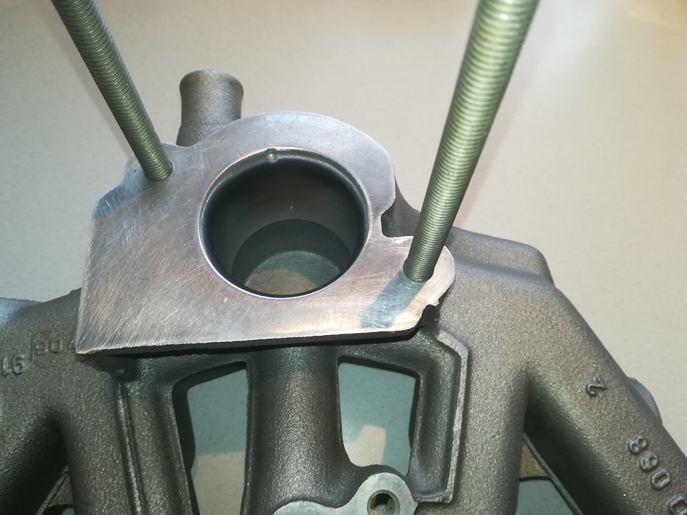 So, Drosselklappe wurde leicht bearbeitet, eine gewisse "Grundrauigkeit" bleibt aber erhalten, auch wenn es nach "Poliert" aussieht. Die Kupferschrauben wurden im gleichen Atemzug mit der Feile abgerundet. Die Dichtung zwischen Drosselklappe und Ansaugbrücke habe ich mit einer Nagelschere vergrößert.