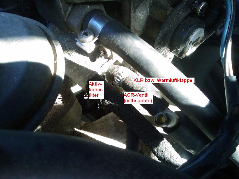 dann gibts fahrerseitig noch 2 anschlüsse, auf dem einen steckt ein schlauch vom aktivkohlefilter, auf dem anderen der schlauch für die warm-luftklappe, bzw. KLR..