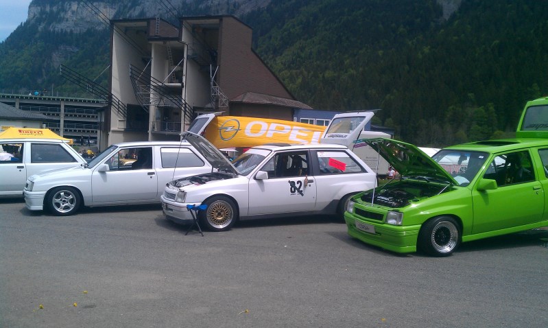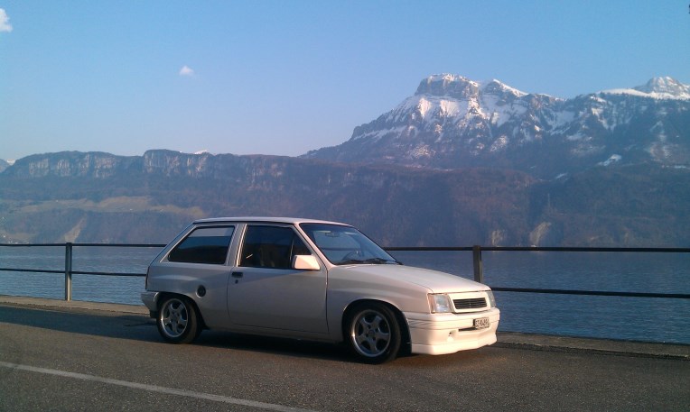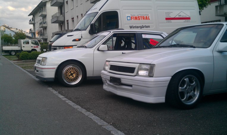 @ZebRockSki ja wo soll ich den anfangen? :P also der weisse 1.6l hat einen sehr grossen presönlichen wert.der Corsa gehörte mal meinem ehemaligem Vorarbeiter,der hatte die ersten umbauten gemacht.als er mich in der Ausbildung mal über einen Pass mitnahm war ich hell begeistert vom Corsa.naja viele jahre später konnte ich ihn dann abkaufen und ich hielt den Corsa immer bei laune,kannst mal den Dani fragen,er hat mier kürzlich die Radläufe hi und vorne gemacht und er weiss wie viel spass das ding macht.ich fahre den corsa nur durch den Sommer,hege und pflege ihn.also mal ein paar technische Daten: gemachter C16SEI,KW Gewinde v2,komplett PU buchsen,Chassis verstärk, Wichers Überrollkäfig aus Stahl weiss pulferbeschichtet,Domstrebe,Stahlflegleitungen,Kadett GSI 16V bremsen vorne,innen ausgeräumt,2Sparco Vollschalensitze und ein altes Panasonic Radio für zwischen durch.Carossierie ohne schiebedach,ohne heckspoiler,Radläufe hinten frisch eingeschweisst durch Daniel :top: , hi + vo gezogen mit einer neulackierung im Original Casablanca weiss.Felgen 14Zoll mit Yokohama A539.