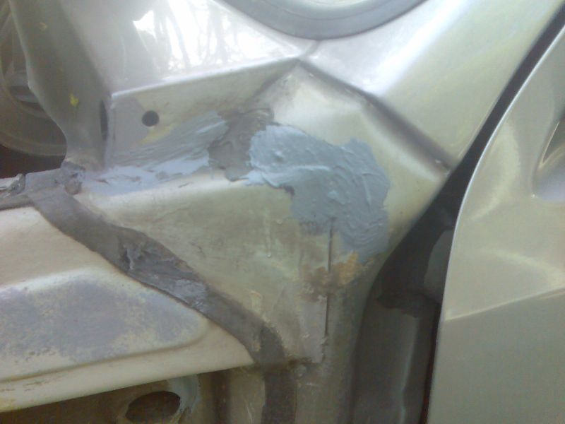 ach naja,wenn man schonmal dabei ist,kann man das ganze auch vorn ordentlich machen.also kotflügel ab,lampen und blinker raus,stoßstange ab und auch den aktivkohlefilter raus.hier gab es allerdings so genannten flugrost.der wurde leicht abgeschliffen und mit zinkpaste bestrichen.ich hoffe,daß dies so vor rost schützt,wie ich mir das denke.da ich das auto ja nicht umlackieren kann und es mir auch nicht leisten kann,es machen zu lassen,wurden diese nicht sichtbaren stellen nur weiter mit unterbodenschutz behandelt.das gleiche passierte bei den kotflügeln an der innenseite.